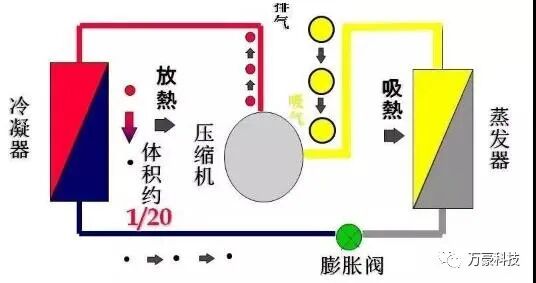 制冷系统就是利用制冷剂的沸点随压力变化的特性,使制冷剂在低压下汽化吸收被冷却物质的热量,降低其温度达到的制冷目的,汽化后的制冷剂又在高压下冷凝成液态。如此循环操作,借助制冷剂在状态变化时的吸热和放热过程,达到调节房间温度的目的。